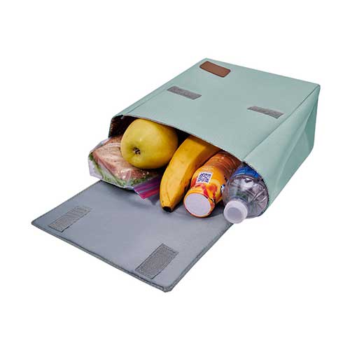 Lonchera con interior metalizado. Bolsa principal estilo solapa con cerrado de velcro. Al frente parche de curpiel. Para mayor comodidad cuenta con asa de transporte superior. Empaca tus alimentos y bebidas para el trabajo, escuela, viaje o picnic. Capacidad para 6 latas.