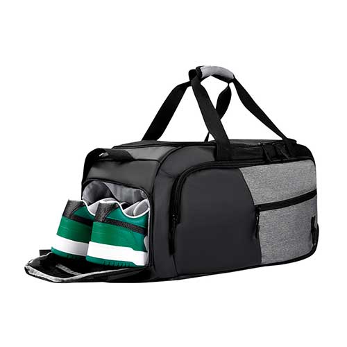Maleta deportiva con bolsa principal y frontal con cierre que combina funcionalidad y estilo en un solo producto. Incluye accesorio para colgar llaves, compartimento para separar tu calzado, bolsillo lateral de malla, asas de mano y correa para hombro ajustable.