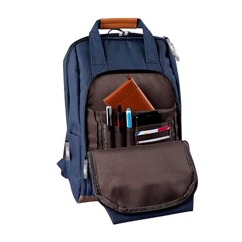 Bolsa principal. Espacio para laptop de 14″ y tablet. Bolsa frontal con organizador, bolsa con cierre y red. Compartimento oculto en la parte posterior, tiranetas acojinados y 3 asas de agarre superior.