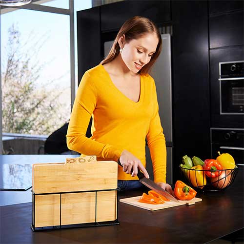 Juego de tablas de bambú para cocina con soporte metálico. Incluye tabla para cortar pollo, carnes rojas, pescado y verduras. Incluye caja individual. La madera es un producto natural el cual puede presentar variaciones en tonalidades y vetas.