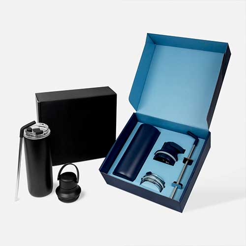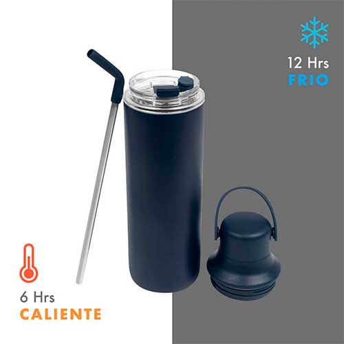 Original set de termo con tapas intercambiables. Incluye termo doble pared, cerrado al vacío. Pared interna y externa de acero inoxidable. Cuerpo con terminado rugoso que permite tener un mejor agarre. Cuenta con una tapa de plástico con doble sistema de rosca, la más amplia permite introducir hielos y otros ingredientes, mientras que su segunda rosca, incluye una boquilla pequeña, que facilita su uso. Su segunda tapa, también con sistema de rosca, incluye una sobre tapa tipo push y ranura especial para popote. Mantiene temperatura caliente 6 hrs y temperatura fría 12 hrs. Capacidad 20 Oz. Incluye popote metálico con boquilla de rubber y caja de regalo..