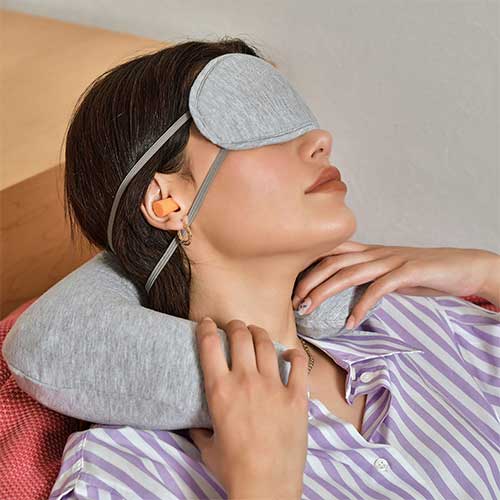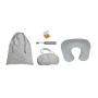 Incluye almohada de viaje inflable, antifaz con elástico ajustable, estuche de plástico con dos gomas para los oídos, cepillo dental plegable y bolsa con jareta.