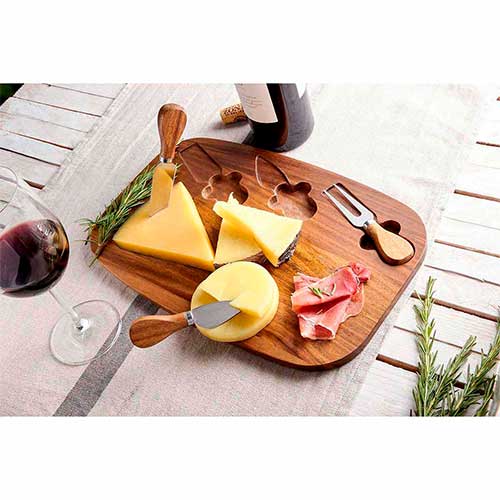 Set con 1 tabla, 2 cuchillos y 1 tenedor para quesos. Incluye caja individual. La madera es un producto natural el cual puede presentar variaciones en tonalidades y vetas.