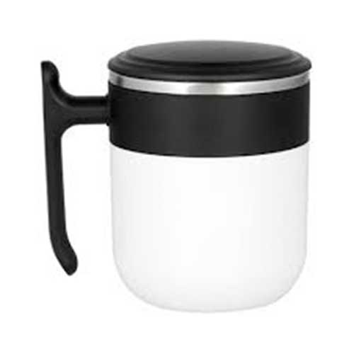 Termo de doble pared con interior de acero inoxidable y exterior de plástico, tapa de cierre a presión y asa de plástico.