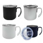 Taza con doble pared de acero inoxidable, asa metálica y tapa traslúcida de cierre a presión con seguro deslizable y boquilla. Incluye bolsa y caja individual.