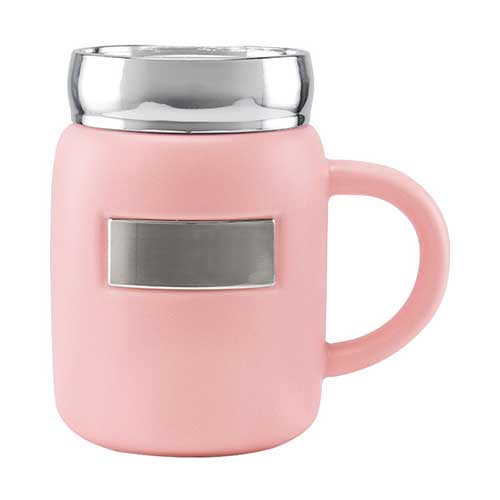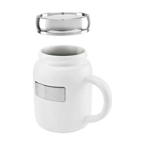 Taza tarro de cerámica con placa metálica para impresión. Tapa de rosca de plástico con recubrimiento metalizado. Terminado mate.