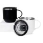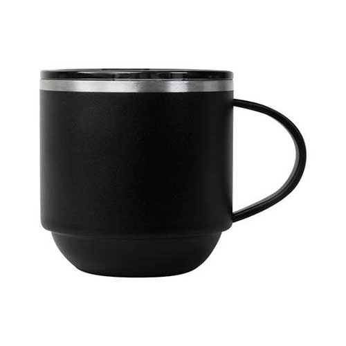 Taza doble pared. Cerrado al vacío. Pared interna y externa de acero inoxidable. Terminado rugoso. Incluye tapa de plástico con sistema push y válvula de seguridad. Mantiene temperatura caliente 6 hrs y temperatura fría 12 hrs.