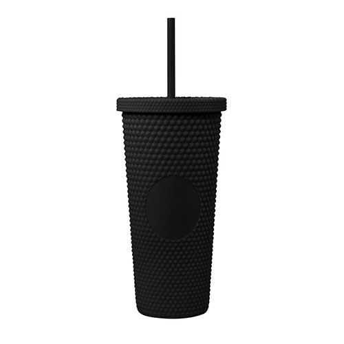 Doble pared. Pared interna y externa de plástico. Tapa de plástico con sistema de rosca. Incluye popote. Cuerpo y tapa con textura diamante y terminado tipo rubber. Capacidad 22 Oz. Base de 6.8 cm de diámetro. Caja individual incluida.