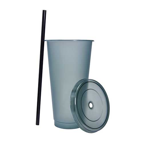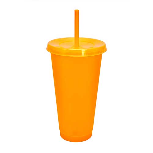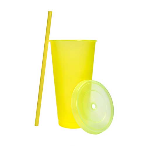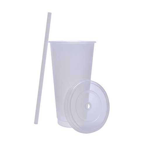 Vaso de plástico con tapa push y popote. Capacidad 27 oz. Base de 6.4 cm de diámetro.